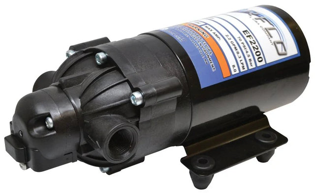 The EF2200 Pump features a silky smooth valve design for quicker priming and a unique pressure switch that gradually cycles the pump to minimize wear on the motor and switch. The automatic power switch saves battery by turning off the pump when no flow is needed. CE approved, it offers a standard mounting pattern for easy installation.