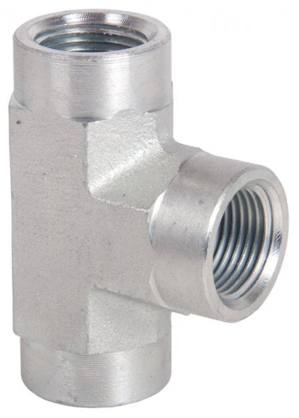 The High-Pressure Plated Steel Female Tee is a durable three-way fitting designed to split or join high-pressure lines. With BSP female threads on all three ports, it provides a secure, leak-free connection between pumps, hoses, and accessories in professional cleaning and hydraulic systems.