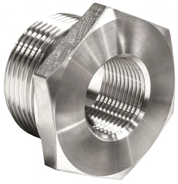 The High-Pressure Stainless Steel Reducing Bush is designed to adapt between different BSP thread sizes, with a BSPT (tapered) male thread on one side and a BSP (parallel) female thread on the other. This makes it ideal for connecting components that use mixed thread styles while ensuring a strong, leak-free seal.