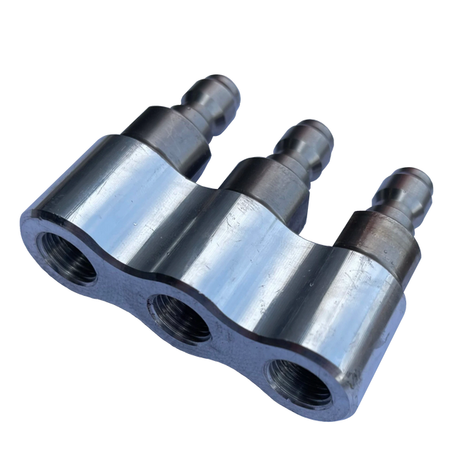Designed to keep your go to nozzles at hand, no more leaving your nozzles behind. Constructed from aircraft grade aluminium to keep weight to a minimum and coupled to Stainless Steel Mini Quick Release Plugs for durability and strength our Tri Jet give you a variety of nozzle to cover a range of cleaning applications.
